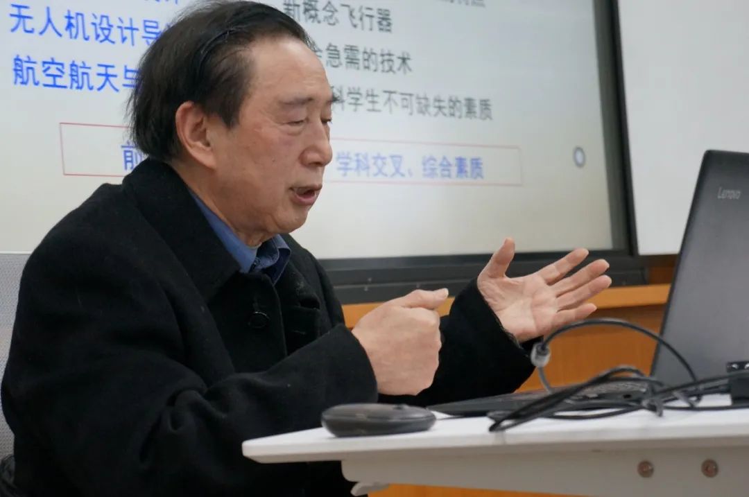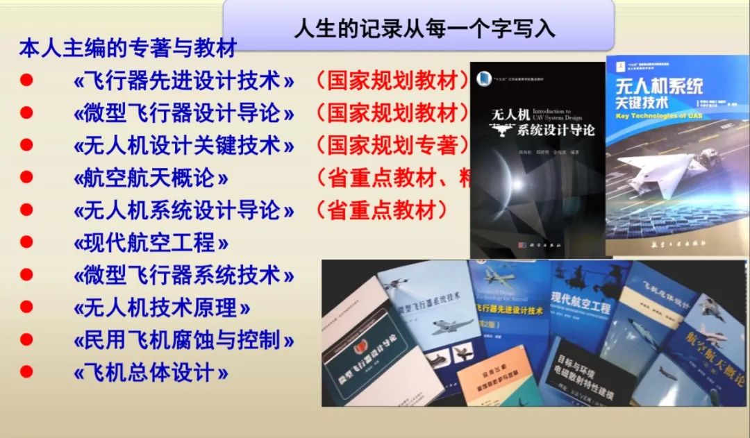 “不管一个人的资质如何,只要他肯踏实奋斗就一定会取得成果,人生的追求要从每一步奋斗做起”。在总结展示创新成果后,昂老师带领同学们聚焦在“奋斗”主题中。昂老师说到,创造需要智慧,聪明来自勤奋和对自己“潜能”的开发;同时创造需要意志,只有不达目的不罢休的苦苦奋斗才可能到达成功的彼岸。昂老师以亲身带领团队前往零下40℃的漠河进行长达一个月的野外飞行试验,以及带领研究生团队前往青海高原,并且第一个登上山峰到达试验基地两件事为例,让同学们直观地认知奋斗的意义。“人生的记录要从每一个字写入”,一本本专著与教材就是昂老师的一段段奋斗史。昂老师已经主编了11本教材和专著,其中«飞行器先进设计技术»、«微型飞行器设计导论»等被列入国家规划教材,《无人机设计关键技术》被列为国家规划专著。看着ppt上的教材名称和图片,让人肃然起敬。“不停的奋斗总会有结果,不懈的奋斗必然有贡献。”在经过了多年的奋斗后,昂老师取得了如国家教学成果奖、国家级精品课程、国家级精品资源共享课、国家精品在线开放课等十余项教学成果,并取得了如国家科技进步二等奖、国防科技进步一等奖、国家级高新技术产品等十余项科研成果,此外还有六项世界科技奖和十余项发明专利。昂老师的丰厚奋斗成果深深的震撼和激励了在场的每一个人。最后,昂老师还引用了保尔柯察金的名言,叮嘱在场的每一位同学珍惜青春,不要虚度年华。