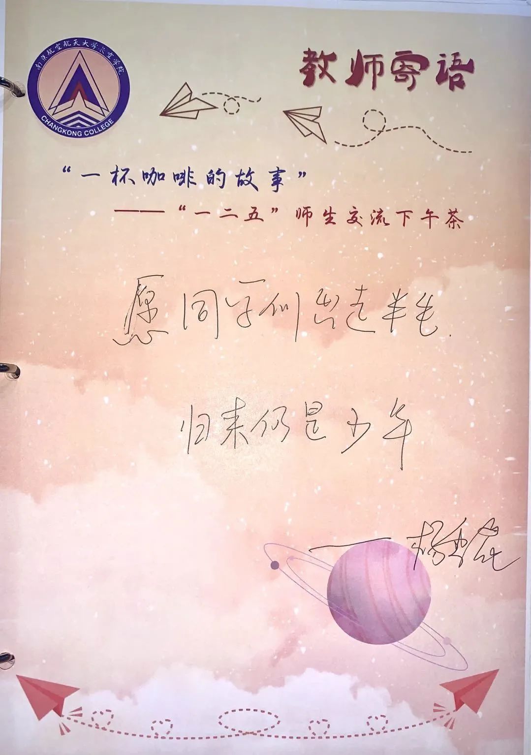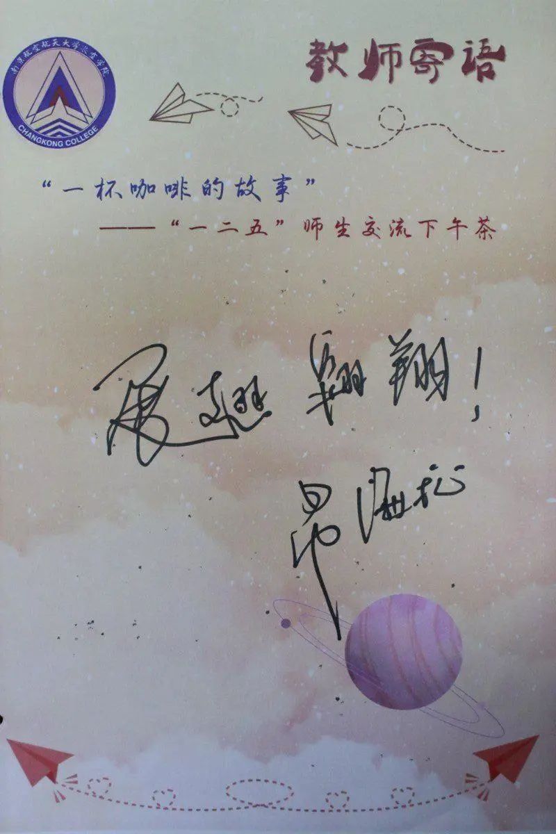 老师的认真负责创新精神乐观积极的人生态度深深影响了我。希望自己能在老师的引导下成为优秀的南航人。谢谢老师!