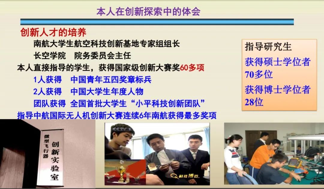 在课程创新方面,昂老师开设了飞行器先进设计技术、微型飞行器设计、无人机设计导论、航空航天与艺术等充满创新性的多门新课程,辐射前沿知识、创新思想、学科交叉、综合素质等多方面学生教育培养内容。昂老师以其中的航空航天与艺术举例,涵盖航空航天与美术、航空航天与舞蹈等,同时播放了《天女散花——空中舞蹈》视频,让学生真切感受到“航空航天与艺术”融合之美,震撼眼球。在创新人才培养方面,昂老师直接指导培养的学生中,已取得学位的有七十多名硕士研究生和二十八位博士研究生,这些学生均在行业内取得了颇为丰富的科研成果。此外,昂老师直接指导的学生中,获得国家级创新大赛奖就有60多项,可谓成果丰硕!在理论创新的探索中,昂老师以照片图像三维复原技术和微型飞行器飞行原理探索为例图文并茂地展示了他的创新成果。同时昂老师以无人机系统的研发举例说明了其在工程创新中的实践成果。昂老师丰富的创新成果令在场的老师和同学们大开眼界,无不赞叹,这些成果对国家航空事业发展做出了突出贡献!