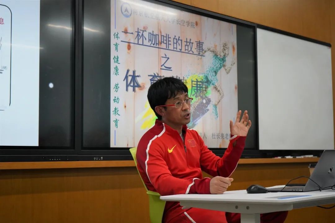 12月10日中午,我校体育部副主任、体育教育训练学博士杜长亮教授作客德赢ac米兰官方合作vwin“一杯咖啡的故事”,与长空学子围绕“大学生运动与健康”进行了一次愉快的交流,杜老师幽默的话语引得在场学生捧腹,强健帅气的身姿也令同学们羡慕不已。杜老师从体育思想、体育文化及科学锻炼三个方面与同学们分享了自己的观点。