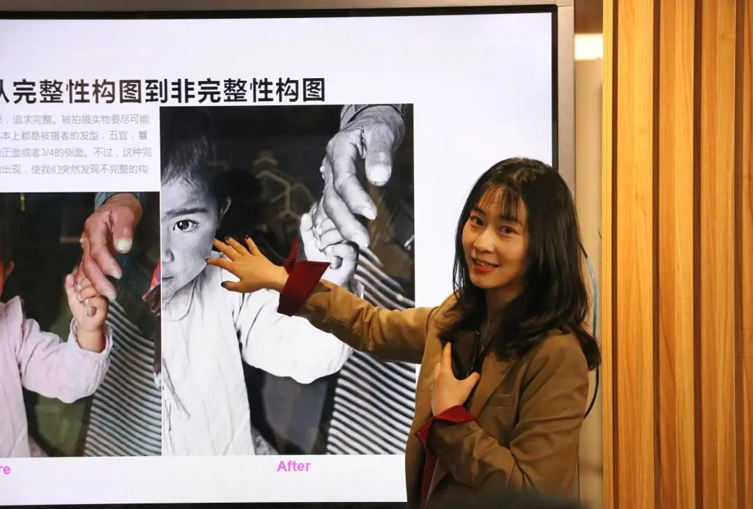 从理论层面出发,李老师先通过几幅学生习作向同学们展示了校园一角。这些熟悉的景物通过视角变化呈现出的视觉效果,给在场的同学带来了全新的体验。李老师也借此引入了摄影中的一个简单理论,即从微观的角度构图,从而解构大环境。人们在日常生活中常规性的判断就是从整体的视角出发,但好的摄影作品却会反直觉,跳脱常规的视角发掘生活中平凡的美。就如同盲人摸象,虽然人们常常会说不能单单从局部的特征做出判断,但在摄影时恰恰与其相反,从整体之中寻找小的细节,使之成为镜头中的画面,就变成了典型的非完整性构图,从而减少画面中无用的繁杂信息,让受众的视线聚焦于作者所表达的核心部分。
